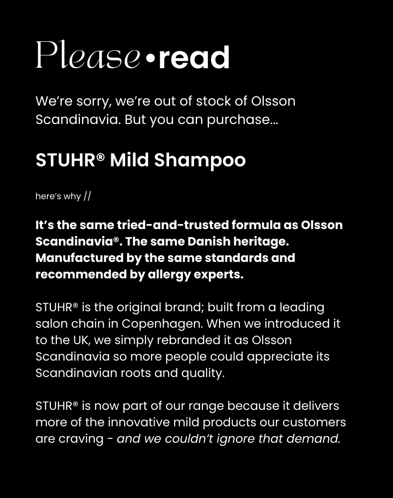 This product is out of stock. Try STUHR® Mild Shampoo - 350ml, sister brand of Olsson Scandinavia®, for the same formula.